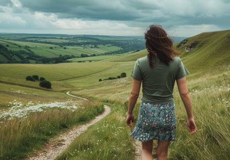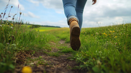 A person walks on a dirt path surrounded by lush green grass and wildflowers. The sky is cloudy, creating a serene atmosphere in this rural setting