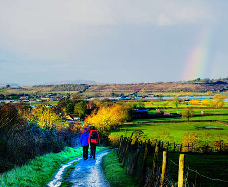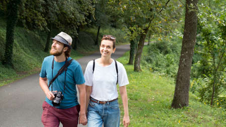 A hipster in a cap and a man carrying a briefcase are strolling down a path on a verdant hill.