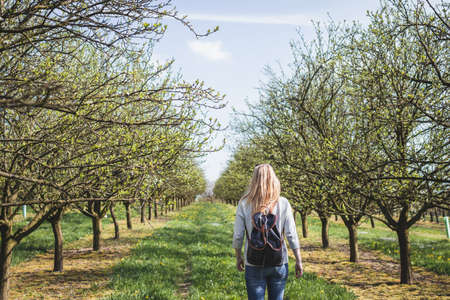 Woman walking in orchard with plum trees at spring. Female tourist with backpack in countryside