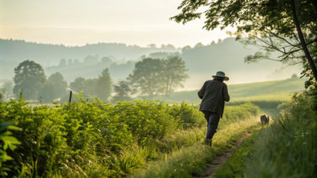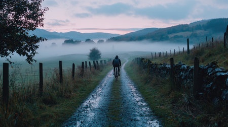 A cyclist navigates a quiet, mist-covered path during early morning hours. Lush green fields and distant hills create a tranquil backdrop to the journey.