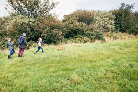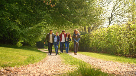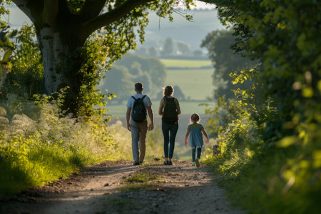 Happy family enjoying a leisurely stroll in the countryside, walking away on a trail
