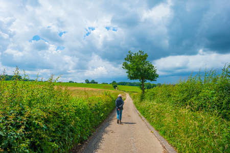Fields and trees in a green hilly grassy landscape under a blue sky in sunlight in spring, Voeren, Limburg, Belgium, June, 2022