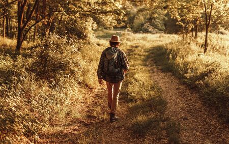 Hiking on woodland trail. Tourist woman on her journey in nature at autumn. Backpacker with hat walking outdoor