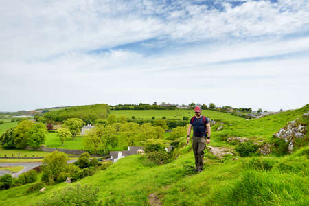 Male hiker descend a trail on a cloudy day in the Killarney National Park. Hiking in County Kerry, Ireland.