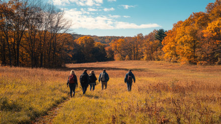 Group of friends enjoying a sunny autumn hike in a vibrant forested area