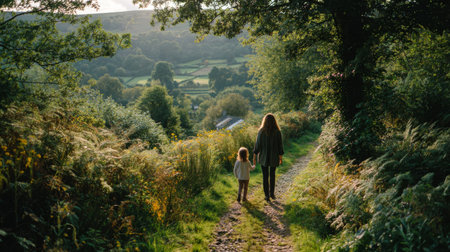 A tranquil scene featuring a mother and child walking hand in hand along a beautiful path surrounded by lush greenery and warm sunlight, enjoying nature