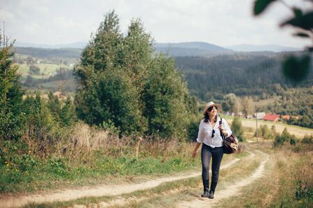 Happy hipster girl with backpack traveling on top of sunny mountain, walking on hills with woods. Stylish woman smiling and enjoying hiking in mountains. Wanderlust and travel.