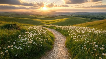 A winding footpath through rolling green fields, where wildflowers bloom beneath the soft glow of afternoon light.
