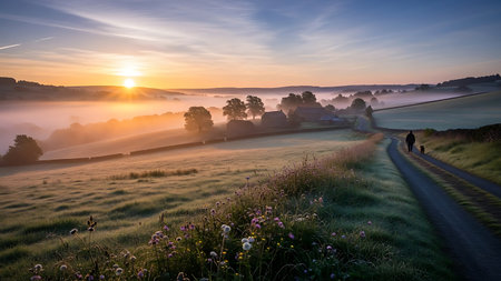 A winding road through a rural landscape with fog rolling in at sunrise, surrounded by grassy fields, trees, and rolling hills. Clear details and vibrant colors enhance visual appeal. resolution use.