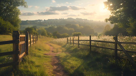Soft green rolling hills are bathed in gentle sunlight, with a dirt path winding past a wooden fence under a blue...