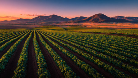 An aerial perspective captures rows of vibrant green crops stretching towards a distant mountain range. The composition showcases the natural patterns of agriculture under a colorful sky with shades of orange and blue. The overall aesthetic is one of growth and sustainability, suitable for various commercial or editorial needs.