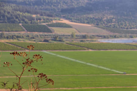 View of agricultural green fields and hills with dry vegetation in the foreground