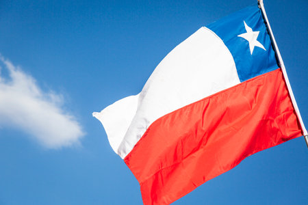 National flag of Chile on blue sky in Santiago capital, South America