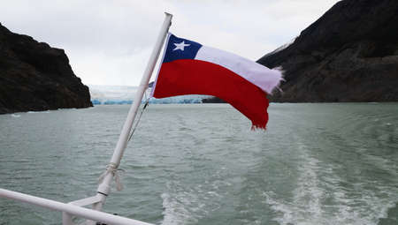 Chilean flag blowing in the wind on Lake Gray, Patagonia, Chile