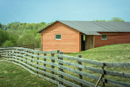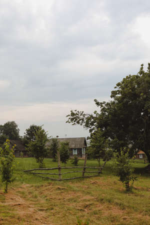 summer picturesque rural landscape with a wooden country farmhouse
