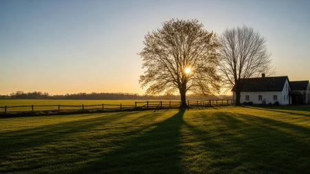 A countryside scene presents a house and a tree with the sun setting. The warm light casts long shadows across a green field. The image showcases a natural outdoor environment with a calm atmosphere. Suitable for use in various visual projects, including websites and print publications.