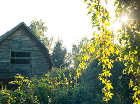 Old abandoned white house on a rural landscape.An old bungalow with a setting sun. AI generated