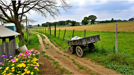 A cart on a rural road in the countryside in springtime.