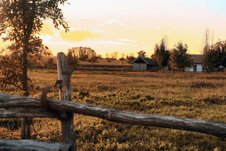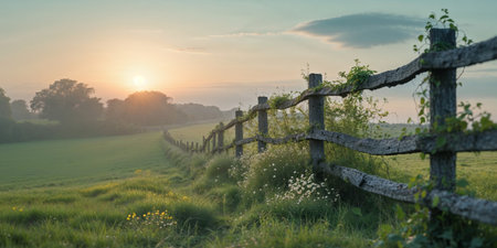 AI Generated. Serene Sunrise Over Pasture with Rustic Fence in Countryside