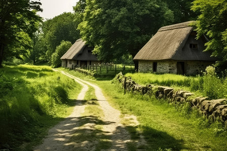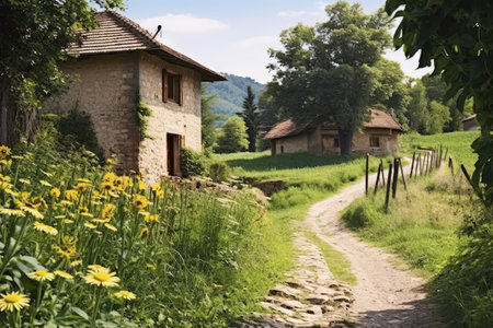 A picturesque image capturing a wooden house nestled in greenery, surrounded by wildflowers and a rustic fence along a tranquil dirt path, showcasing serene countryside beauty.