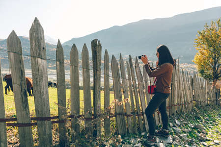 Asian tourist woman is taking a landscape photo of rural farm over the fence.