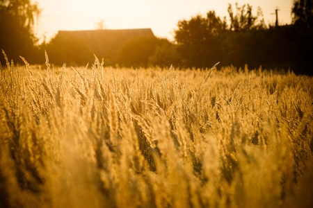 Weathered barn wood surrounded by golden grass at sunset near a rural landscape