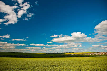 Green Field of wheat, blue sky and sun, white clouds. wonderland