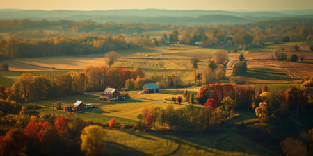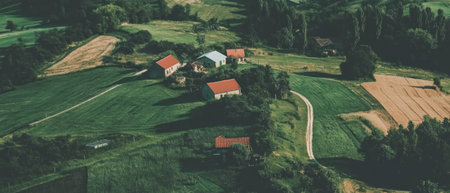 Cinematic countryside pattern featuring serene farmhouses and lush greenery from above