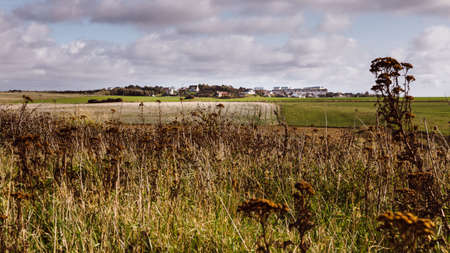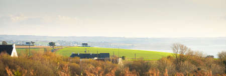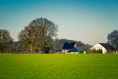 green country side scenery with houses during sunset, Breskens, Zeeland, The Netherlands