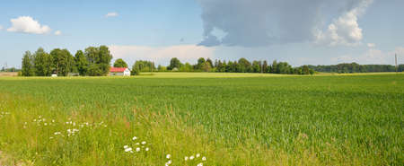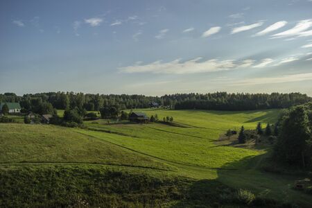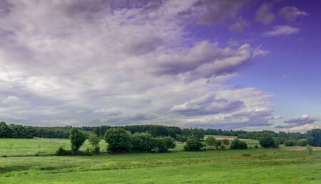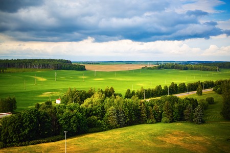 Summer landscape with green meadows, fields, trees and forests. Minsk region, Belarus