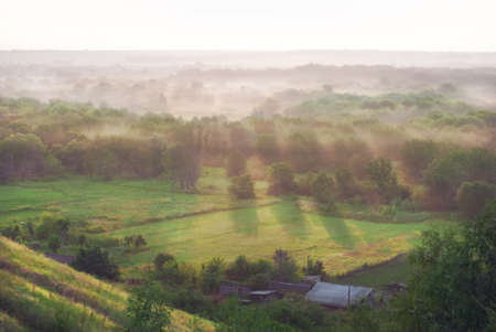 A beautiful sunrise landscape of a misty meadow. Summertime scenery of Northern Europe.