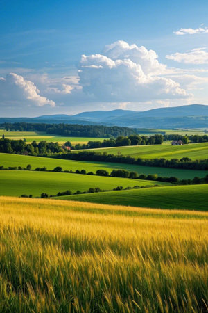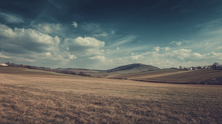 Discover a breathtaking rural landscape featuring rolling hills and vast fields beneath a vibrant blue sky filled with soft, fluffy clouds, perfect for outdoor enthusiasts.
