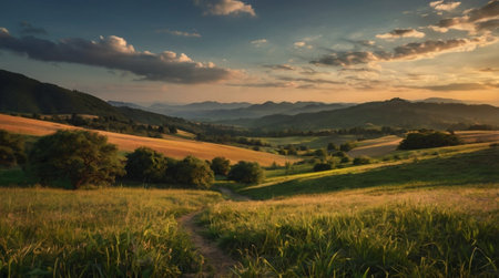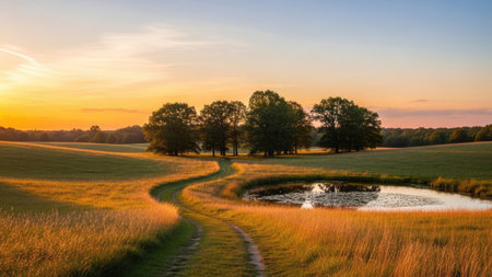An outdoor landscape depicts a winding path leading to a pond under a setting sun. The image features a vibrant sky with warm colors illuminating the rolling hills and a body of water. The overall composition could be suitable for various commercial or editorial applications.