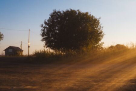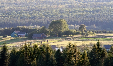 A small village in the middle of a hilly agricultural field in the warm light of a June sunset. picturesque rural summer evening landscape