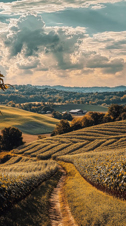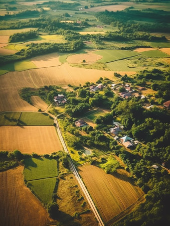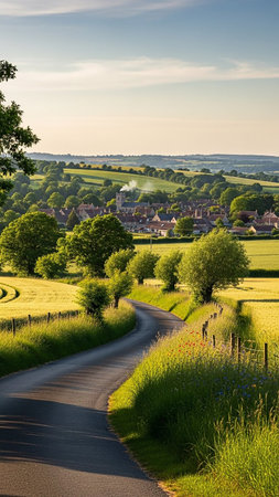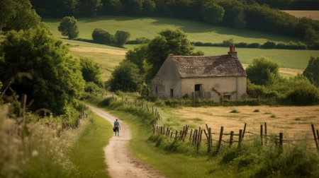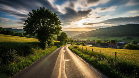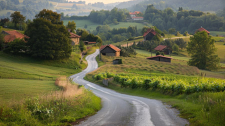 In the midst of a remote countryside the winding road stretches on passing by quaint villages and picturesque farms showcasing the . AI generation