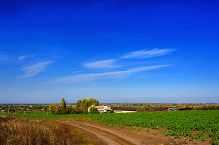 Beautiful scene of agriculture in a rural area at sunset. Green grassland, house, and cloudy sky.