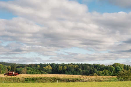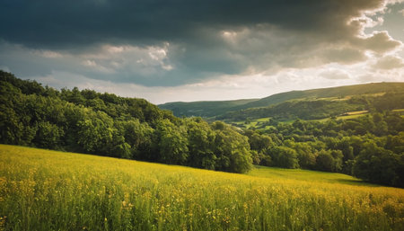 Green hills of a plowed agricultural field and forest. Idyllic summer rural scene. Dramatic sky after the rain. Pure nature, environnement, farm, countryside living, ecotourism. Panoramic view