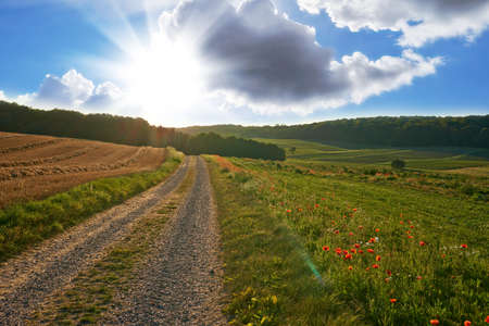 Beautiful landscape of a farm with a path at sunrise with a cloudy blue sky. Large endless land with lush green grass and red flowers growing. A hill with bright sun shining in the background