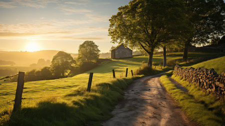 Morning sunlight illuminating a winding unpaved path through rolling green countryside hills and fields with old wooden fence posts