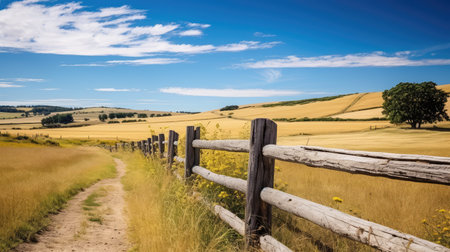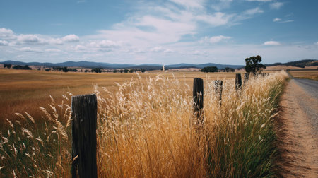 A scenic wheat field beside a country road, vintage fence running alongside, under a calm sky