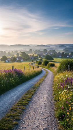 A winding gravel road meanders through a sunlit meadow abundant with colorful wildflowers and green grass, leading to a distant village.