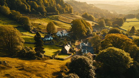 Aerial view of a cottage town amidst rolling hills, charming houses, idyllic countryside, peaceful surroundings, detailed and scenic depiction Generative AI