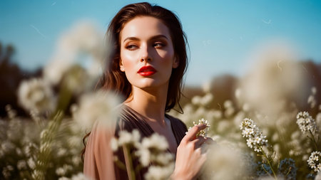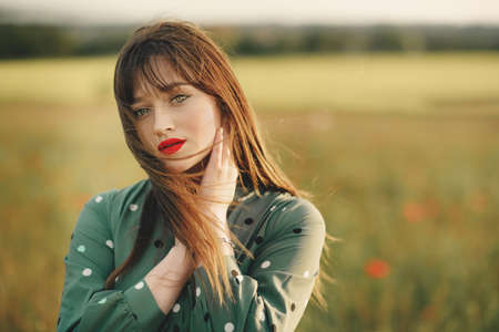 Portrait of seductive beautiful model posing on nature autumn day. Confident young woman with red lips looking camera standing valley green grass alone close up. Attractive girl enjoying landscape.