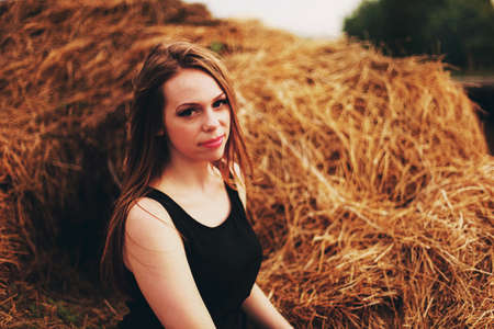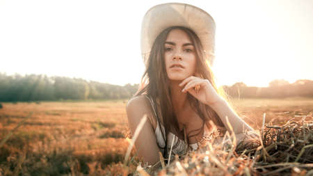 Rural girl on straw bale in a field, a cowboy hat, Beautiful woman on a haystack
