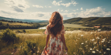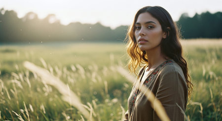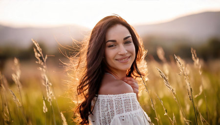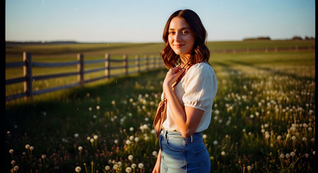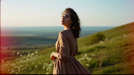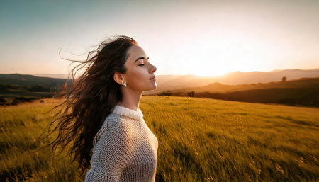 A woman stands in a lush field her arms outstretched embracing the warm sunlight. The vibrant background showcases rolling hills under a bright sky capturing a moment of serenity and confidence.