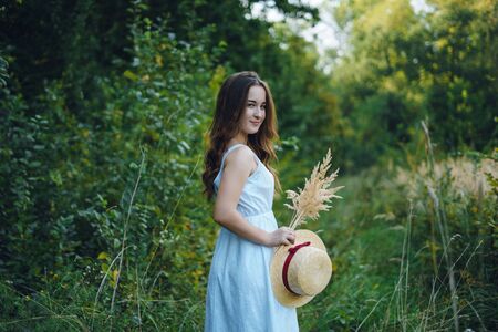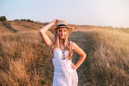 Beautiful woman wearing in white dress and straw hat enjoying nature outdoors at sunset.