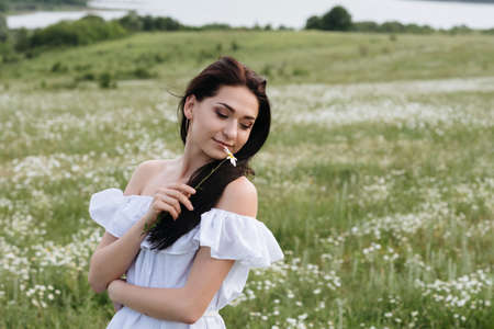 Mystical Twilight Beauty Closeup Portrait of Woman in White Dress Standing in Field