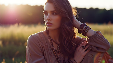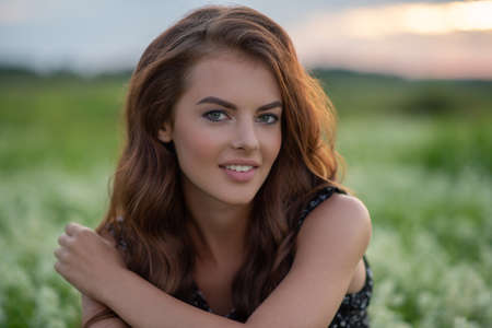 Beautiful young woman sitting in a field at sunset. Beauty, fashion.