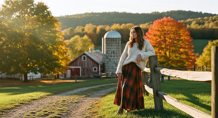 Beautiful young woman in a plaid skirt and sweater on a farm at sunset.