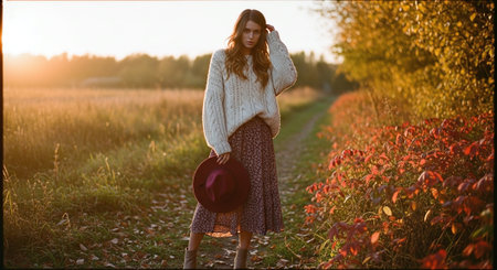 Young beautiful woman in a sweater with a hat in a field at sunset